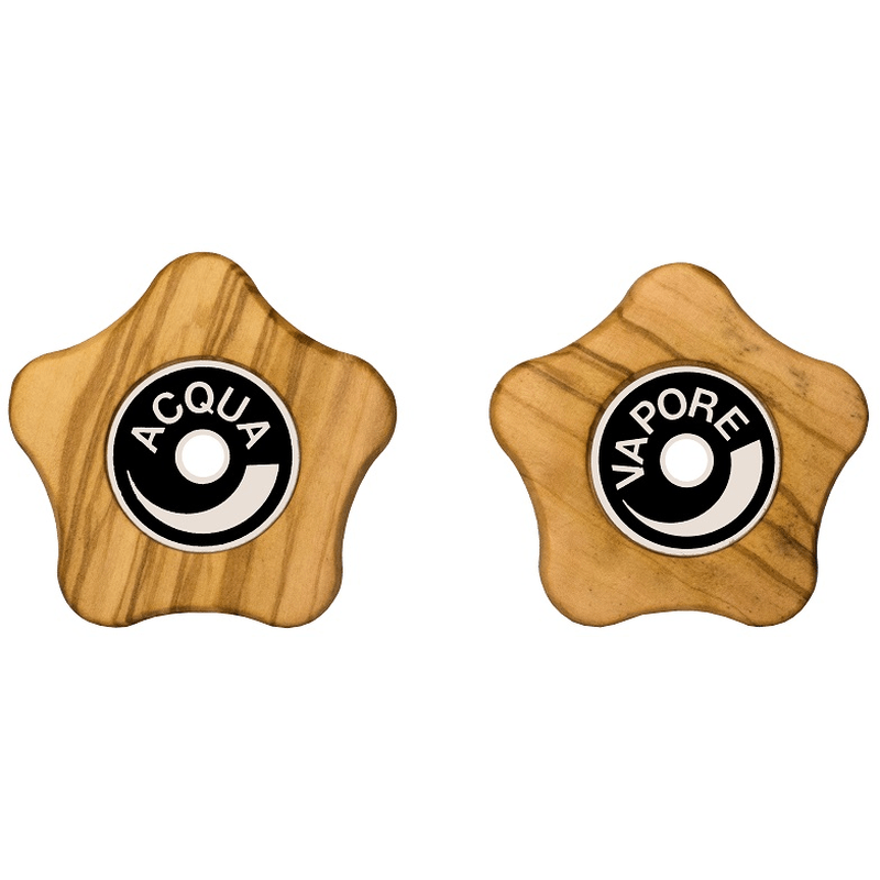 - 2 поворотные ручки из оливкового дерева: для горячей воды «Aqua», для пара «Vapore».