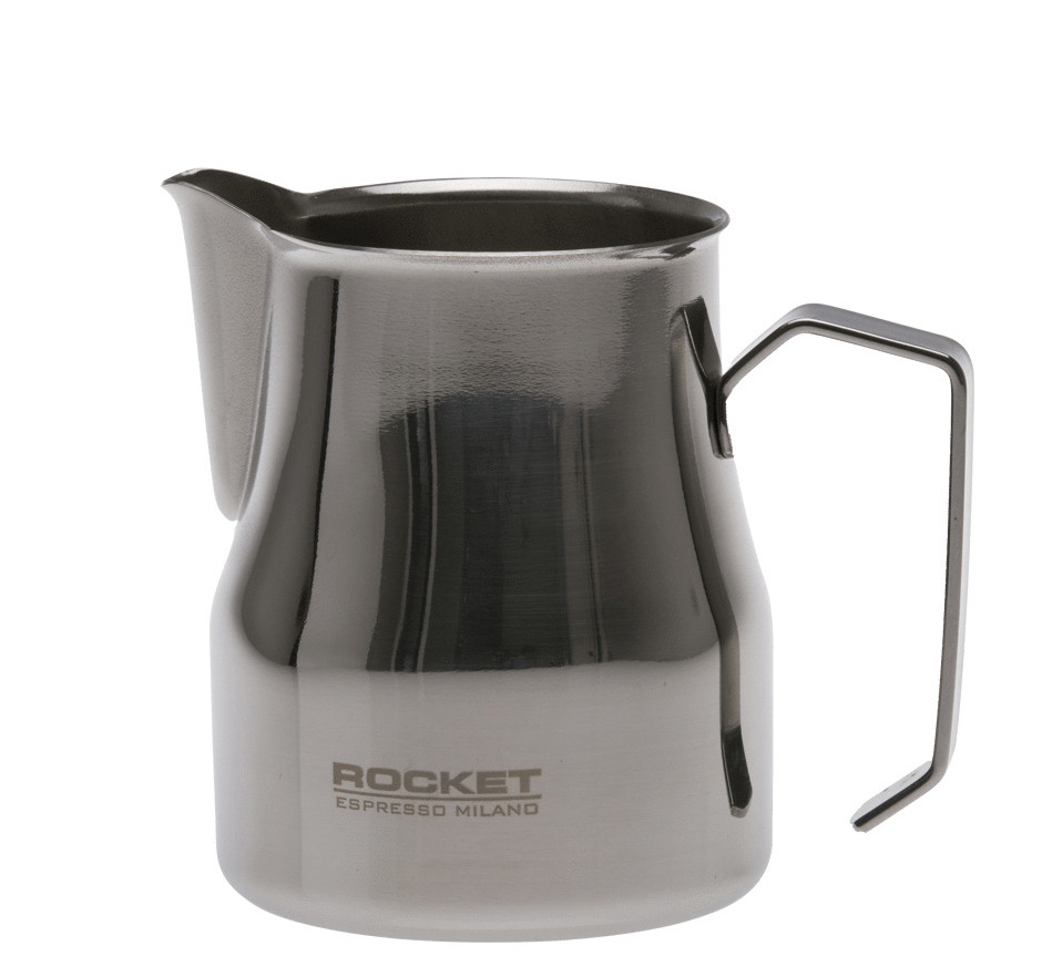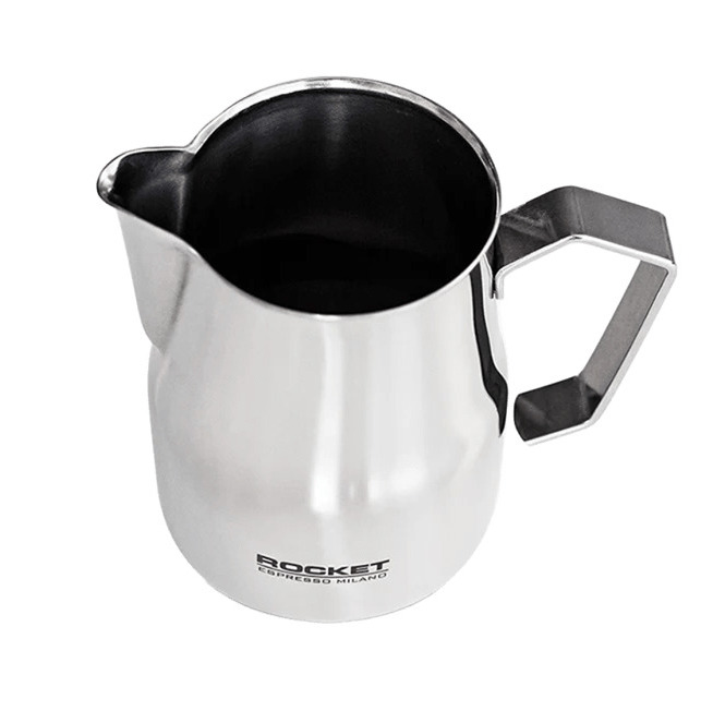 Высококачественный питчер из нержавеющей стали с глянцевой поверхностью и логотипом Rocket для идеальной молочной пены.