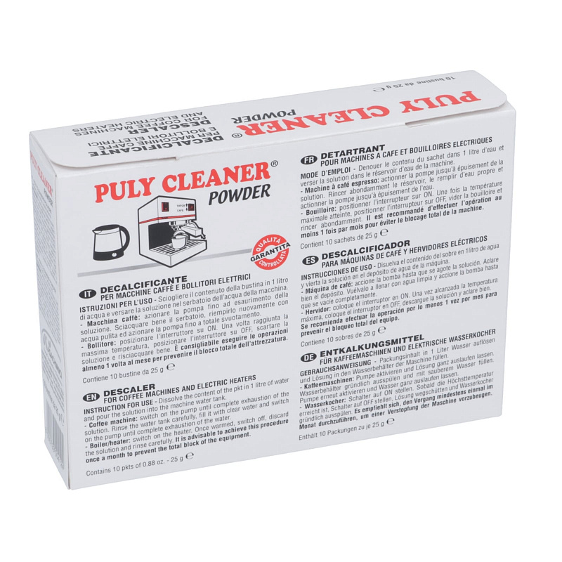 Средство Puly Cleaner идеально подходит для бережного и эффективного очищения кофемашин, кофеварок и бытовых электрических чайников от отложений солей. Средство позволяет произвести декальцинацию труднодоступных мест, что продлевает срок службы вашего устройства, а также сохраняет аромат и вкус любимых напитков.