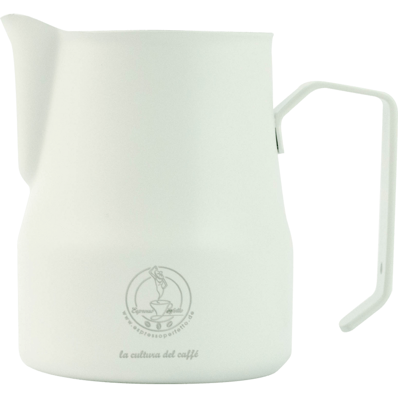 Профессиональный питчер белого цвета с логотипом Espresso Perfetto от мирового производителя кофейных аксессуаров Motta.