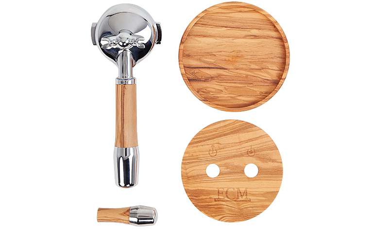 - высококачественный хромированный портафильтр с двойным носиком и ручкой из оливкового дерева;