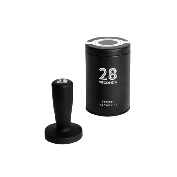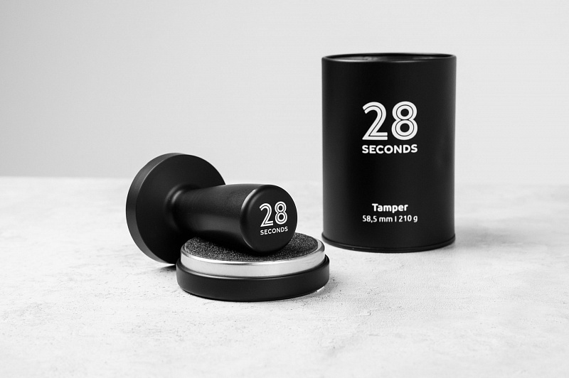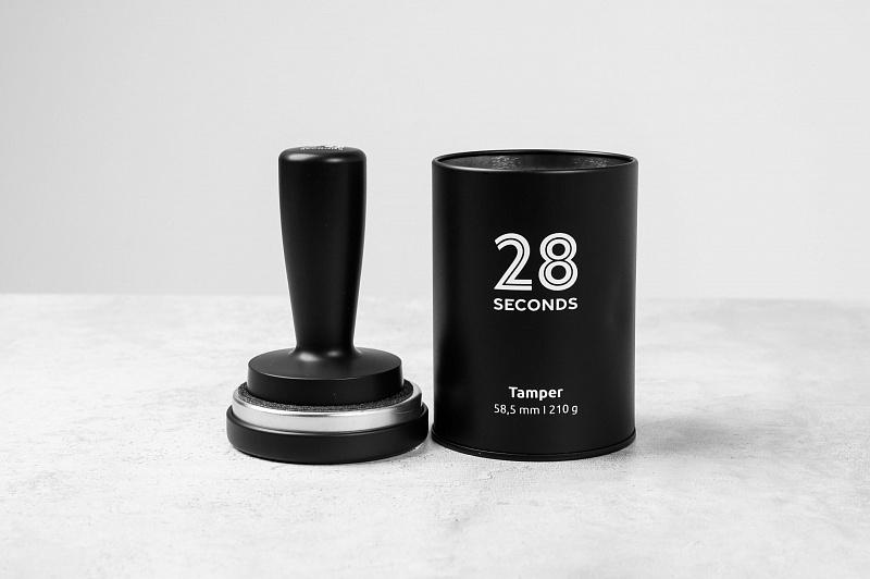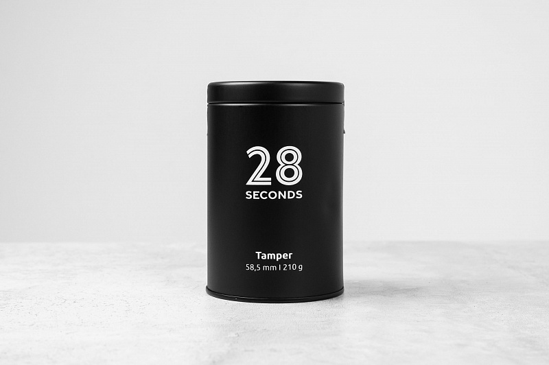 Темпер минималистичного дизайна изготовлен из алюминия и имеет основание 58.5 мм. Сверху на ручку нанесен логотип 28 Seconds. Идеально подходит для стандартных портафильтров.