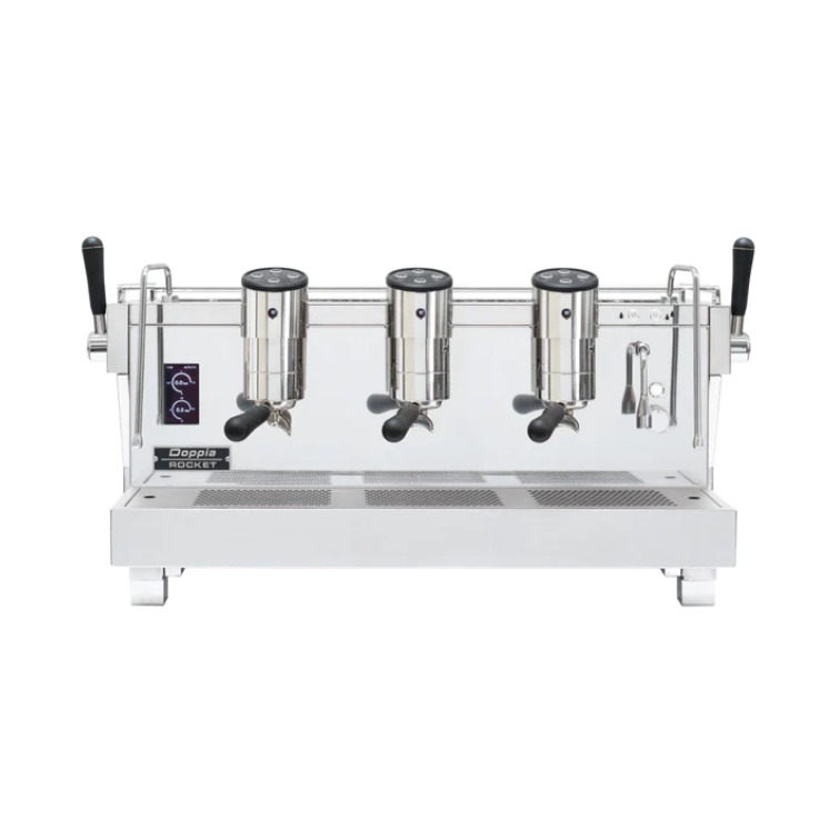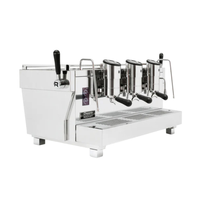 Rocket RE Doppia – коммерческая двухбойлерная кофемашина с 3 сатурированными (встроенными в кофейный бойлер) группами в корпусе из нержавеющей стали, которая отвечает требованиям самых высококлассных кафе.