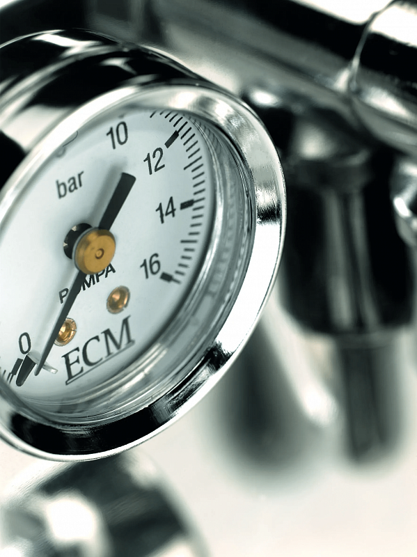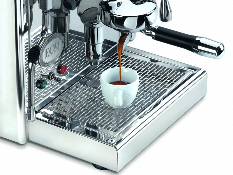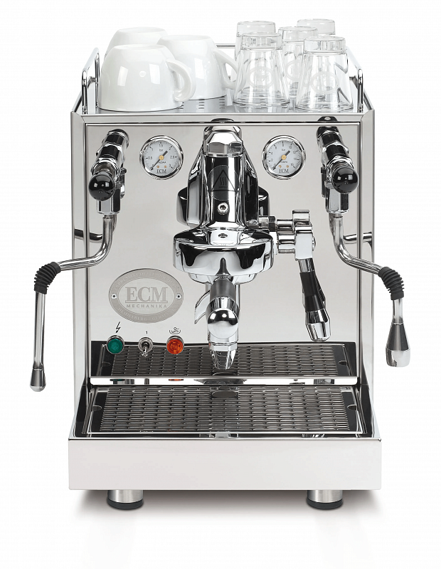 Стильная двухконтурная рожковая кофемашина ECM с ручной варочной группой E61, инновационным инфузионным цилиндром из нержавеющей стали, высококачественным корпусом из хромированной нержавеющей стали с полностью съемным поддоном для чашек и хромированным рейлингом. Паровой бойлер на 2.1 л из нержавеющей стали с прессостатом и армированной Incoloy 800 нагревательной системой, ностальгические рычажные краны, низкошумный ротационный насос, манометры давления бойлера на 3 Бар и давления насоса на 16 Бар, паровая трубка с шарнирным соединением и аэратор горячей воды с профессиональными поворотными кранами, резервуар для свежей воды объемом 3 л с всасывающим клапаном. Варочная группа нагревается системой циркуляции горячей воды.