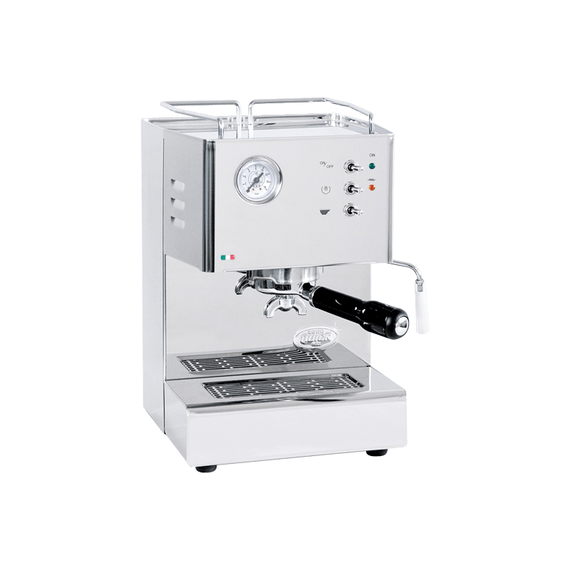 Orione - компактная, быстро разогревающаяся одноконтурная рожковая кофемашина с цельным термоблоком от Quick Mill с медными трубками и функцией быстрого пара, полированным хромированным корпусом из нержавеющей стали с боковыми ламелями для проветривания и металлическим рейлингом. Светодиодные индикаторы, ностальгические тумблеры, интервальный насос Ulka с регулятором от Quick Mill для стабилизации давления и снижения уровня шума, манометр давления насоса на 16 Бар, поворотная паровая трубка с воздухозаборником для удобного вспенивания молока, съемный резервуар для свежей воды на 1.5 л с индикатором уровня воды. Система термоблока полностью опорожняется после выдачи каждой отдельной порции.