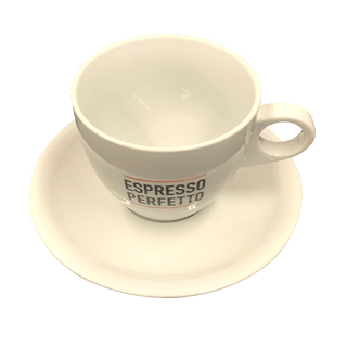 Красивая толстостенная большая белая чашка из фарфора с логотипом Espresso Perfetto и блюдцем в комплекте.