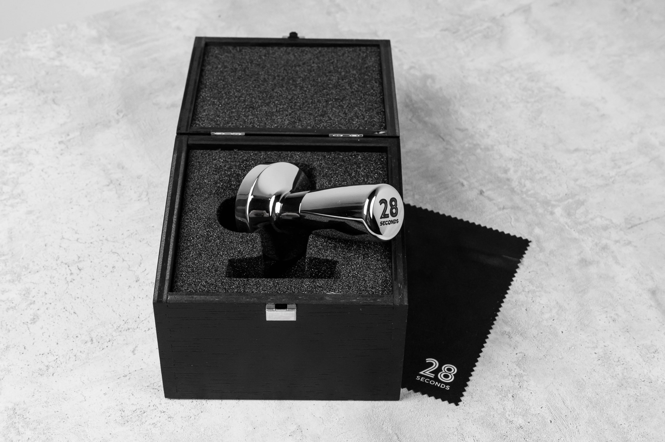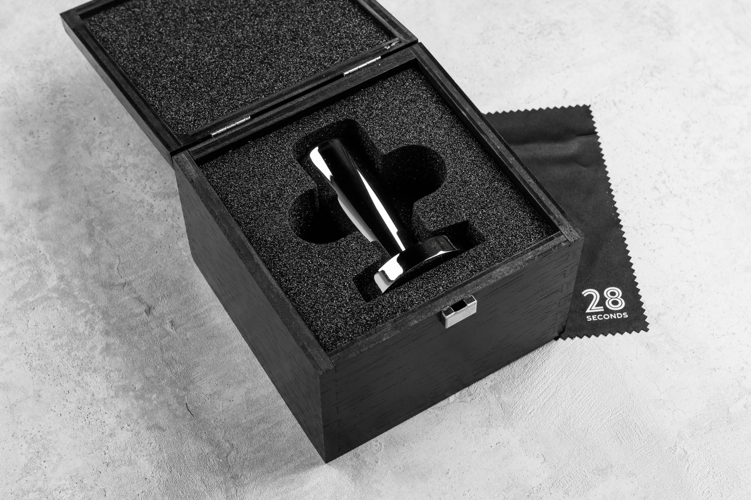 Темпер минималистичного дизайна изготовлен из цельного куска высококачественной нержавеющей стали и имеет основание 58.5 мм. Сверху на ручку нанесен логотип 28 Seconds. Идеально подходит для стандартных портафильтров.