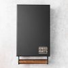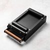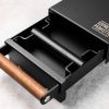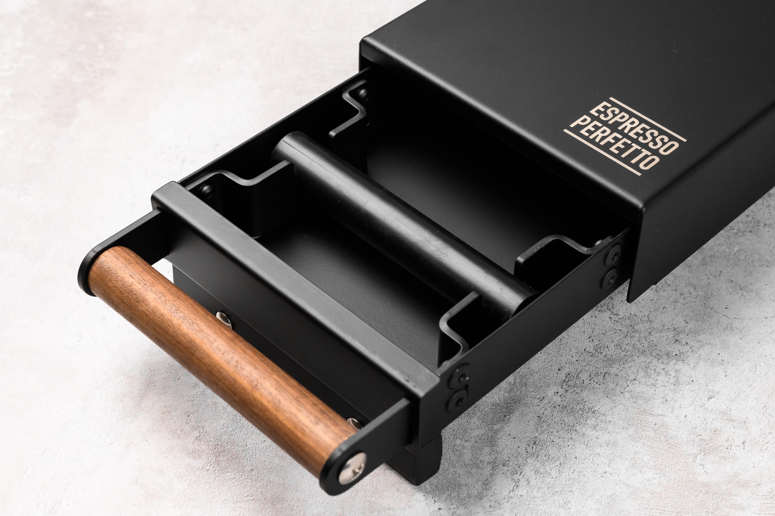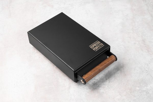 Ящик для кофейных отходов из массивной полированной нержавеющей стали черного цвета с логотипом Espresso Perfetto и ручкой из оливкового дерева.