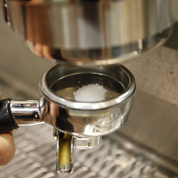 - Насыпать 1-3 грамма средства для чистки кофемашин в "слепой" холдер и установить его в группу